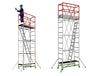 Trabattello in acciaio FE360 zincato elettroliticamente contro la ruggine. Offre grandissima sicurezza di lavoro e facilità di montaggio senza attrezzi. Può inoltre essere chiuso a libro e passare da porte standard. Montanti: in tubo di acciaio tondo Ø mm 38. (base, staffe, campate 3,6 ml, ringhiera protezione 1,20 ml, piano con botola, impalcato di base, scala interna).